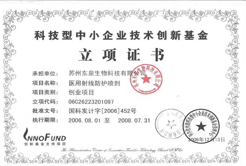 1. 獲科學(xué)技術(shù)部科技型中小企業(yè)技術(shù)創(chuàng)新基金管理中心頒發(fā)的《科技型中小企業(yè)技術(shù)創(chuàng)新基金立項(xiàng)證書(shū)》 。立項(xiàng)代碼:06C26223201097