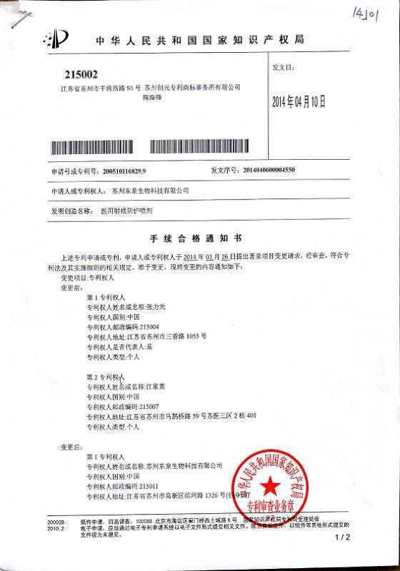 • 醫(yī)用射線防護(hù)噴劑發(fā)明專(zhuān)利證書(shū)