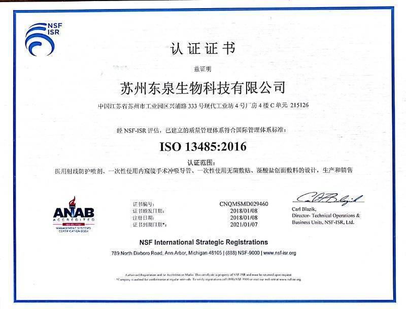 1.   企業(yè)經(jīng)NSF-ISR評(píng)估,已建立的質(zhì)量管理體系符合國(guó)際管理體系標(biāo)準(zhǔn),于201818日獲《ISO13485:2016認(rèn)證證書(shū)》 。