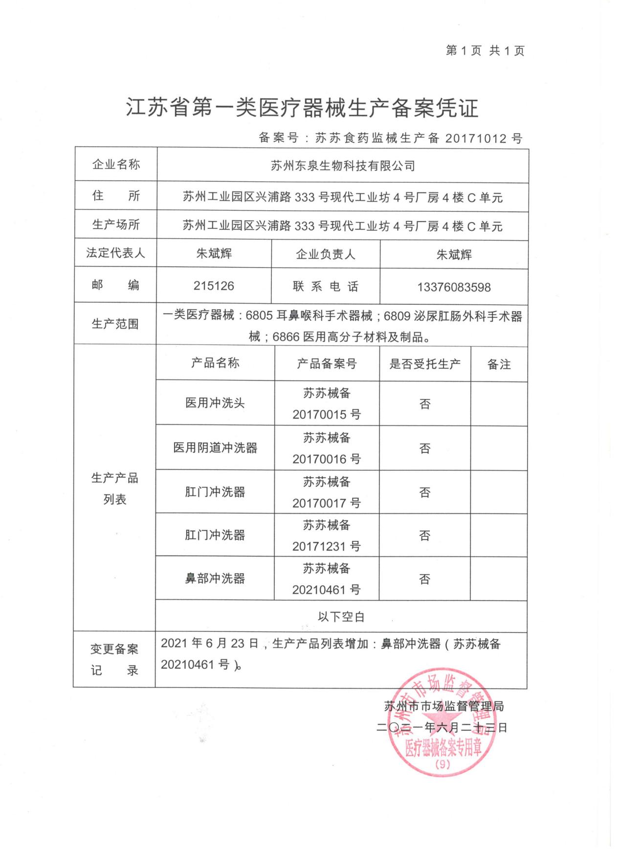 • 江蘇省第一類(lèi)醫(yī)療器械生產(chǎn)備案憑證