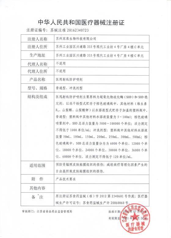 蘇州東泉生物科技有限公司創(chuàng)建于2006年,現(xiàn)位于蘇州工業(yè)園區(qū),是專(zhuān)業(yè)從事醫(yī)療器械產(chǎn)品研發(fā)、生產(chǎn)、銷(xiāo)售的高新技術(shù)企業(yè),也是國(guó)內(nèi)較早開(kāi)展自由基清除劑超氧化物歧化酶(SOD)的生物效應(yīng)研究,并對(duì)超氧化物歧化酶進(jìn)行了純化研究的企業(yè)。企業(yè)研發(fā)生產(chǎn)的高新技術(shù)產(chǎn)品 《醫(yī)用射線防護(hù)噴劑》,獲國(guó)家發(fā)明專(zhuān)利。